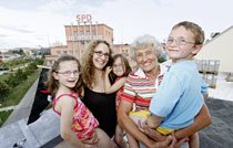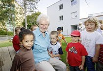 Herta Juhas und Fred Jantschke sind inzwischen eingezogen und mitten im Praxistest. Der Optimismus der beiden Älteren hat bislang keinerlei Schaden genommen und wird noch übertroffen von der Begeisterung der alleinerziehenden Mütter. Verena Grosam beispielsweise, deren drei Kinder sich über die allgemeine Zuwendung im Haus und »sooo viele Omis« freuen, zählt dazu. »Einfach genial« finden alte und junge Bewohner den Gedanken, einander behilflich zu sein. Was sie alle erfolgreich bewerkstelligen wollen, nennt Christoph Arnold, Vorstandsvorsitzender der andersWohnen eG, offiziell »Versorgungsverbund innerhalb eines familien- und kinderfreundlichen Projekts, das die Lebensqualität des Einzelnen und die Wertevermittlung zwischen den Generationen fördern soll«.