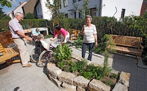 Die schöne neue Umgebung macht auch für die Betreuer die nicht immer einfache Arbeit etwas leichter und in jedem Fall angenehmer. Schon lange hatte die Geschäftsführerin die Idee, einen Garten anzulegen. Doch es fehlte an Geld. Die Tagessätze von 50 bis 74 Euro pro Patient – je nach Pflegestufe – decken nur das Nötigste ab: Fahrdienst, Verpflegung und natürlich die Personalkosten. Reserven für eine außergewöhnliche Anlage sind nicht vorhanden, und vielleicht wäre die Grünzone nie entstanden, wäre da nicht die Nürnberger Bürgerstiftung gewesen. Sie hat 30.000 Euro gegeben, nachdem Karin Eisgruber und Susanne Strattner von der Stiftung gemeinsam mit Caritas-Leiterin Klug das Konzept des Sinnesgartens entwickelt hatten. Die Stifterinnen haben die Projektleitung übernommen, ihr Kollege Helmut Hantke ist ebenfalls vor Ort. Sie gehören zu den bundesweit 17.000 Menschen, die sich regelmäßig mit Zeit, Geld oder Ideen in einer der rund 300 Bürgerstiftungen in Deutschland engagieren.