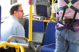 Haas und sein Team haben bei Tests in fahrenden Bussen ermittelt, welche Kräfte beim Anfahren, im Fahrbetrieb und beim Bremsen auf im Fahrzeug stehende Personen wirken. Außerdem haben die Forscher gemessen, wie viel Zeit Fahrgäste unterschiedlichen Alters und mit unterschiedlichen Einschränkungen zum Ein- und Aussteigen und zum Einnehmen eines Sitzplatzes brauchen.