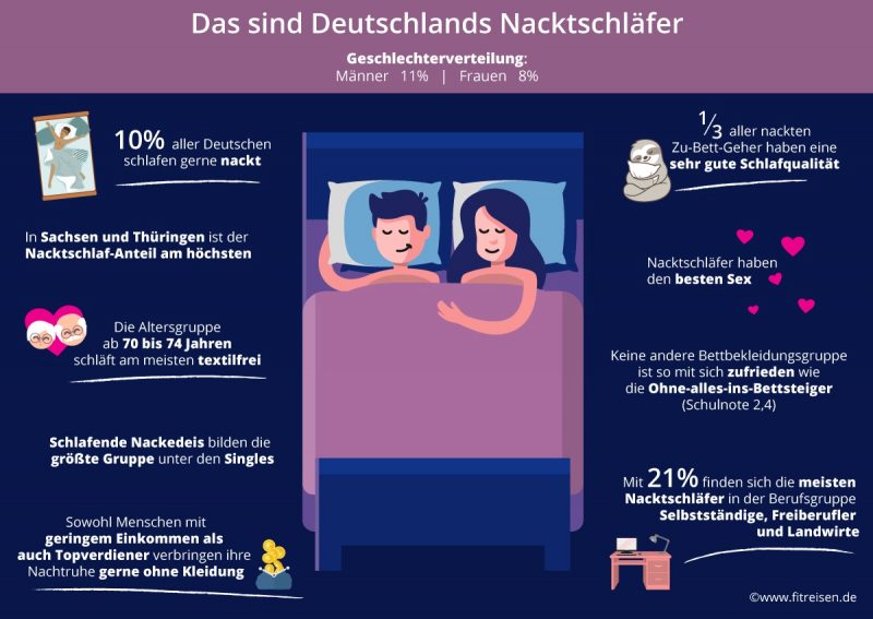 Wie bekleidet schlafen die Deutschen? Hat eine hüllenlose Bettruhe Einfluss auf die Schlafqualität, sind Nacktschläfer zufriedener als Pyjamaträger? Der Gesundheits- und Wellnessreiseveranstalter Fit Reisen hat mit Deutschlands größtem Marktforschungsinstitut, der Nürnberger GfK, untersucht, wie es um das (Nackt-)Schlafverhalten in der Bundesrepublik bestellt ist und wie sich die mehr oder weniger bekleidete Bettruhe auf die allgemeine Gesundheit auswirkt. Die wichtigsten Ergebnisse finden Sie hier zusammengefasst.